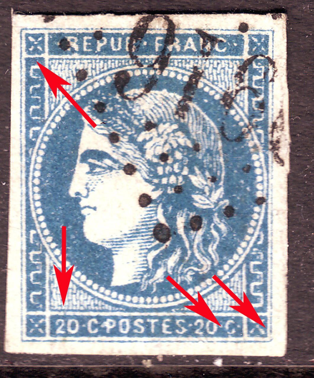 léger point de couleur à la partie inférieure du cadre droit