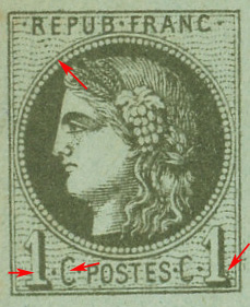 très petit point de couleur contre le trait droit du 1 de gauche, à hauteur du point qui le sépare du C