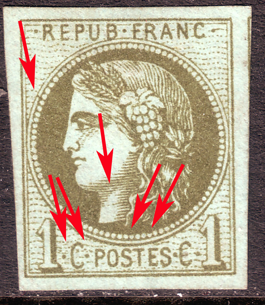 5 petits points parasites (quelquefois 6 ou 7) de part et d'autre du C de gauche (comme 7 et 12)