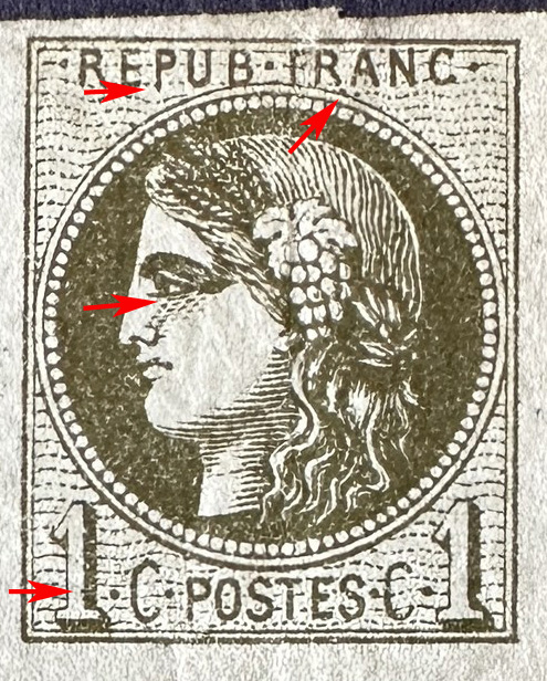 petit point de couleur au dessous du pied droit du R de FRANC