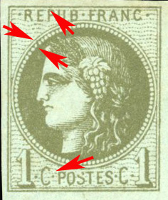 saillant de couleur sur le cercle intérieur à l'aplomb de la branche vericale du E de REPUB et petite perle immédiatement à gauche