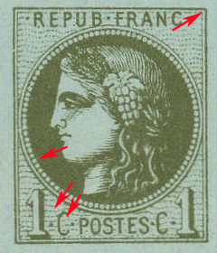 2 points de la gravure originale mal retouchés de part et d'autre du C de gauche (ce signe est visible sur les n° 7 et 8 et quelquefois sur d'autres n°)