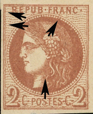 perle diminuée au dessous du pied gauche du A de FRANC