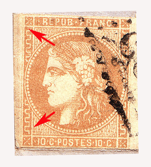 saillant de couleur à droite du cartouche gauche à hauteur du 1er élément vertical de la grecque inférieure