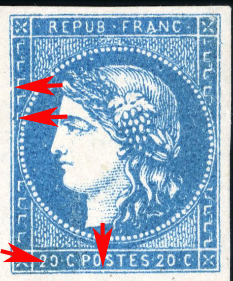 saillant de couleur sur le cartouche en face du dernier élément vertical de la grecque supérieure gauche