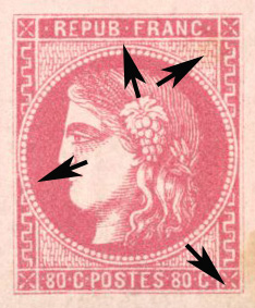 très petit point de couleur sur le cadre gauche à hauteur de la partie supérieure de la grecque inférieure gauche (ces signes sont très faibles)